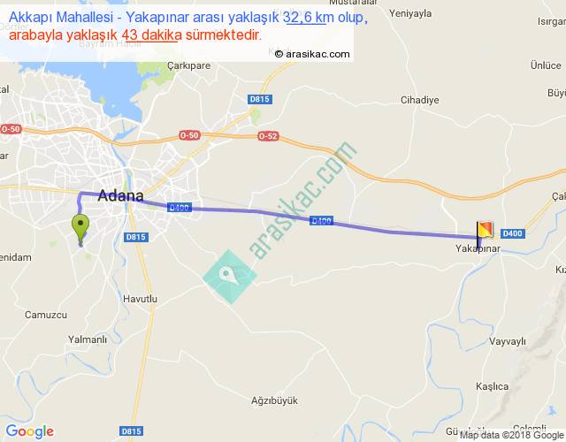 Akkapı Mahallesi - Yakapınar arası yaklaşık olarak 90 km/h ile yukarıda belirtilen sürede olup, iki yerin kuş uçuşu uzaklığı (mesafesi) 27'dir. Yolculuk otobüsle 55 dakika sürmektedir.