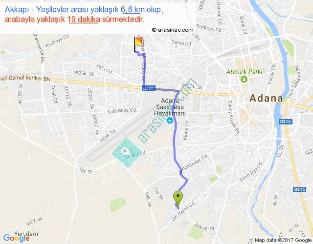 Akkapı - Yeşilevler arası yaklaşık olarak 90 km/h ile yukarıda belirtilen sürede olup, iki yerin kuş uçuşu uzaklığı (mesafesi) 5'dir. Yolculuk otobüsle 24 dakika sürmektedir.
