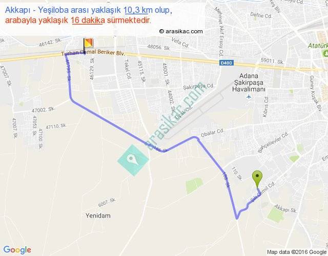 Akkapı - Yeşiloba arası yaklaşık olarak 90 km/h ile yukarıda belirtilen sürede olup, iki yerin kuş uçuşu uzaklığı (mesafesi) 6'dir. Yolculuk otobüsle 20 dakika sürmektedir.