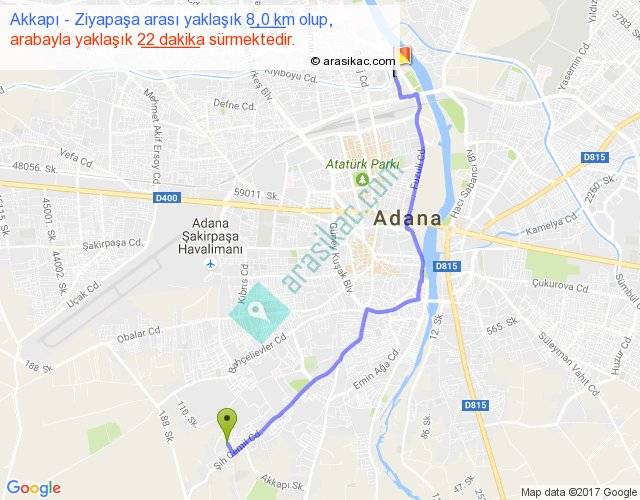 Akkapı - Ziyapaşa arası yaklaşık olarak 90 km/h ile yukarıda belirtilen sürede olup, iki yerin kuş uçuşu uzaklığı (mesafesi) 6'dir. Yolculuk otobüsle 28 dakika sürmektedir.