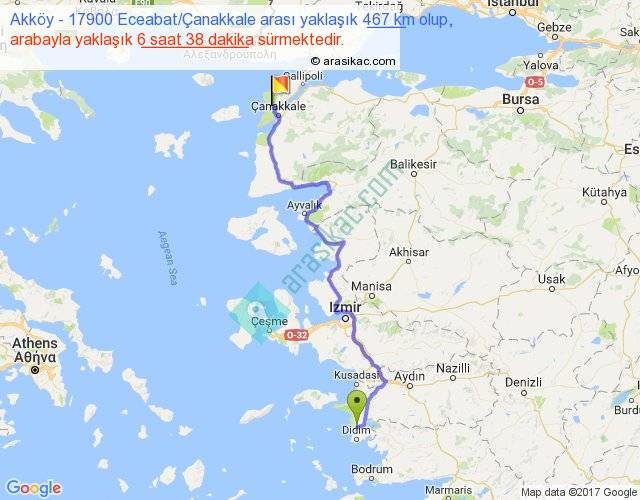 Akköy - 17900 Eceabat Çanakkale arası yaklaşık olarak 90 km/h ile yukarıda belirtilen sürede olup, iki yerin kuş uçuşu uzaklığı (mesafesi) 312'dir. Eğer belirtilen yerler arasında uçak seferi var ise bu süre uçakla 28 dakika'ya kadar düşebilir. Yolculuk otobüsle 8 saat 37 dakika sürmektedir.