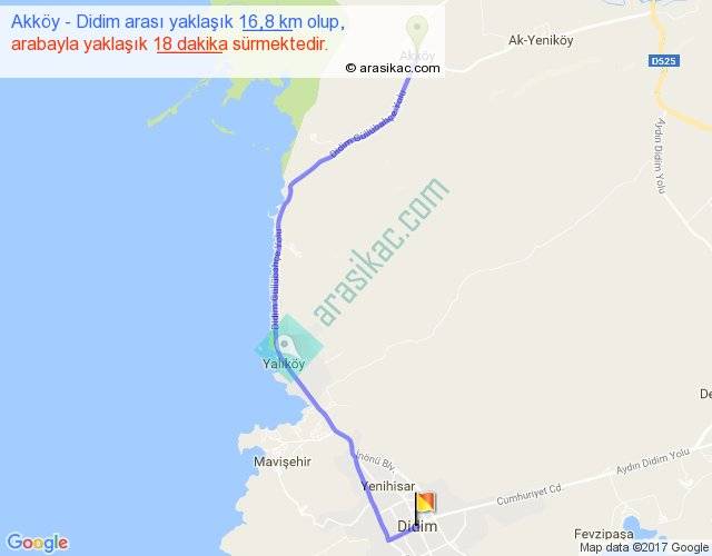 Akköy - Didim arası yaklaşık olarak 90 km/h ile yukarıda belirtilen sürede olup, iki yerin kuş uçuşu uzaklığı (mesafesi) 13'dir. Yolculuk otobüsle 23 dakika sürmektedir.