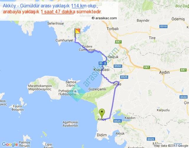Akköy - Gümüldür arası yaklaşık olarak 90 km/h ile yukarıda belirtilen sürede olup, iki yerin kuş uçuşu uzaklığı (mesafesi) 70'dir. Yolculuk otobüsle 2 saat 19 dakika sürmektedir.