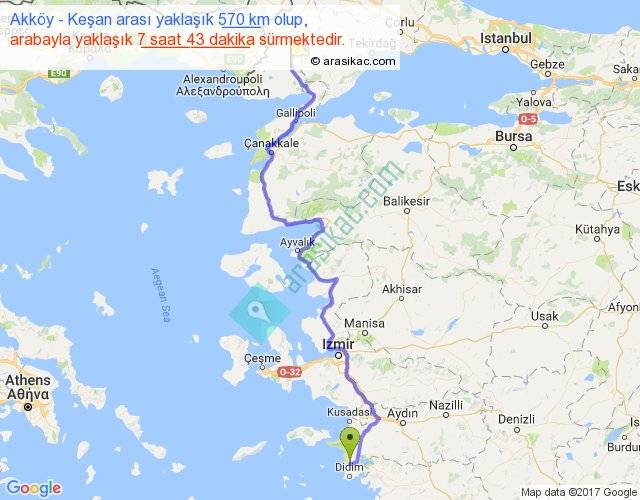 Akköy - Keşan arası yaklaşık olarak 90 km/h ile yukarıda belirtilen sürede olup, iki yerin kuş uçuşu uzaklığı (mesafesi) 376'dir. Eğer belirtilen yerler arasında uçak seferi var ise bu süre uçakla 34 dakika'ya kadar düşebilir. Yolculuk otobüsle 10 saat 1 dakika sürmektedir.