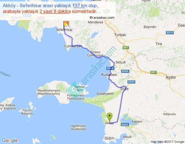 Akköy - Seferihisar arası yaklaşık olarak 90 km/h ile yukarıda belirtilen sürede olup, iki yerin kuş uçuşu uzaklığı (mesafesi) 86'dir. Yolculuk otobüsle 2 saat 46 dakika sürmektedir.