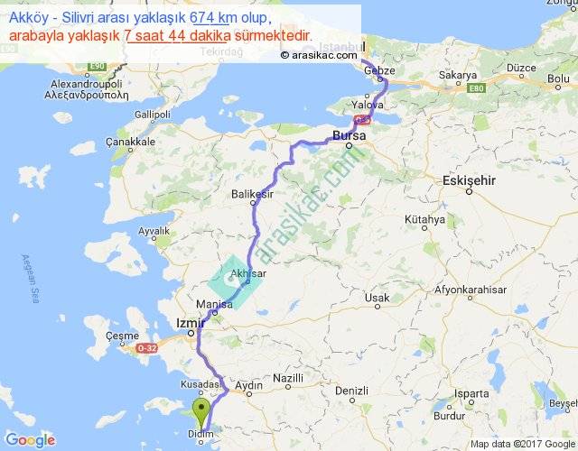 Akköy - Silivri arası yaklaşık olarak 90 km/h ile yukarıda belirtilen sürede olup, iki yerin kuş uçuşu uzaklığı (mesafesi) 405'dir. Eğer belirtilen yerler arasında uçak seferi var ise bu süre uçakla 37 dakika'ya kadar düşebilir. Yolculuk otobüsle 10 saat 3 dakika sürmektedir.