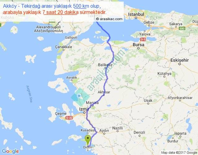Akköy - Tekirdağ arası yaklaşık olarak 90 km/h ile yukarıda belirtilen sürede olup, iki yerin kuş uçuşu uzaklığı (mesafesi) 386'dir. Eğer belirtilen yerler arasında uçak seferi var ise bu süre uçakla 35 dakika'ya kadar düşebilir. Yolculuk otobüsle 9 saat 32 dakika sürmektedir.