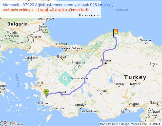 Akmescit - 37920 Ağlı Kastamonu arası yaklaşık olarak 90 km/h ile yukarıda belirtilen sürede olup, iki yerin kuş uçuşu uzaklığı (mesafesi) 676'dir. Eğer belirtilen yerler arasında uçak seferi var ise bu süre uçakla 1 saat 02 dakika'ya kadar düşebilir. Yolculuk otobüsle 15 saat 10 dakika sürmektedir.