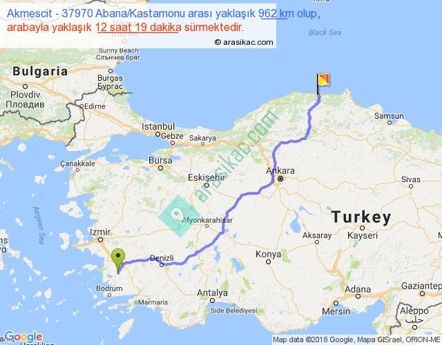 Akmescit - 37970 Abana Kastamonu arası yaklaşık olarak 90 km/h ile yukarıda belirtilen sürede olup, iki yerin kuş uçuşu uzaklığı (mesafesi) 725'dir. Eğer belirtilen yerler arasında uçak seferi var ise bu süre uçakla 1 saat 06 dakika'ya kadar düşebilir. Yolculuk otobüsle 16 saat 0 dakika sürmektedir.
