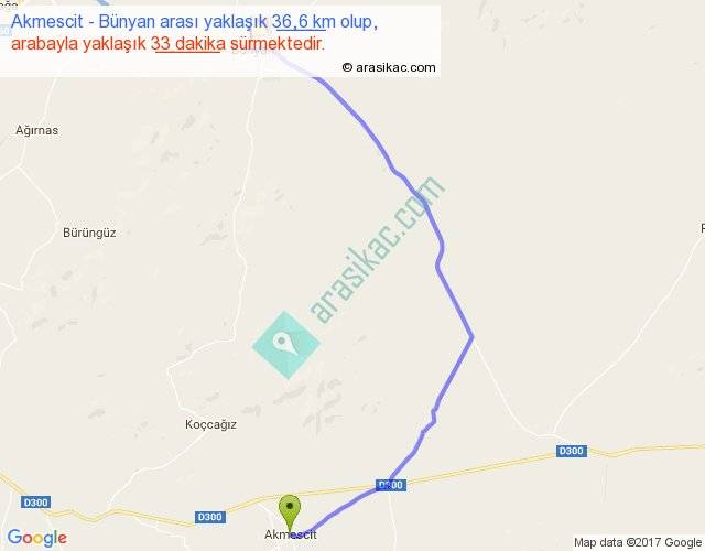 Akmescit - Bünyan arası yaklaşık olarak 90 km/h ile yukarıda belirtilen sürede olup, iki yerin kuş uçuşu uzaklığı (mesafesi) 26'dir. Yolculuk otobüsle 42 dakika sürmektedir.