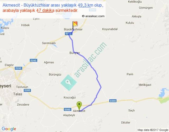 Akmescit - Büyüktuzhisar arası yaklaşık olarak 90 km/h ile yukarıda belirtilen sürede olup, iki yerin kuş uçuşu uzaklığı (mesafesi) 37'dir. Yolculuk otobüsle 1 saat 1 dakika sürmektedir.