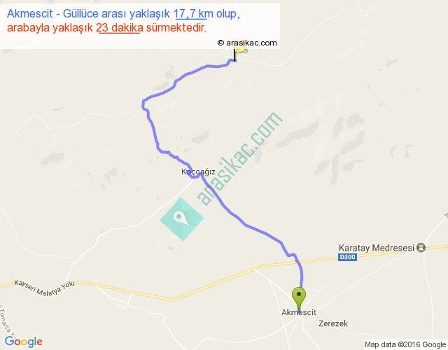 Akmescit - Güllüce arası yaklaşık olarak 90 km/h ile yukarıda belirtilen sürede olup, iki yerin kuş uçuşu uzaklığı (mesafesi) 11'dir. Yolculuk otobüsle 29 dakika sürmektedir.