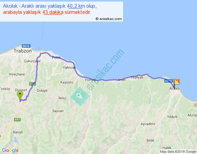 Akoluk - Araklı arası yaklaşık olarak 90 km/h ile yukarıda belirtilen sürede olup, iki yerin kuş uçuşu uzaklığı (mesafesi) 29'dir. Yolculuk otobüsle 55 dakika sürmektedir.