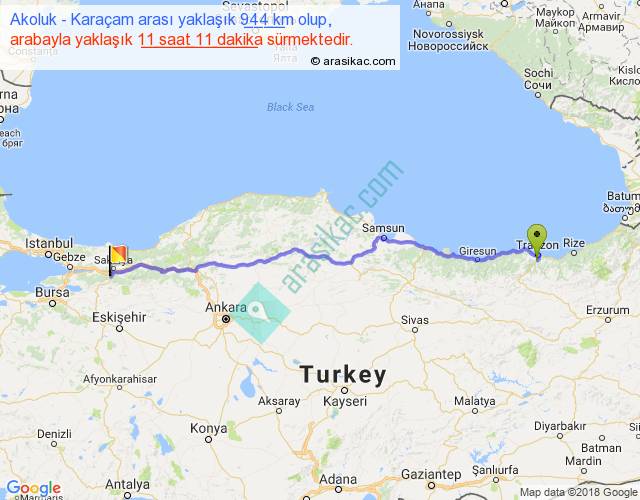Akoluk - Karaçam arası yaklaşık olarak 90 km/h ile yukarıda belirtilen sürede olup, iki yerin kuş uçuşu uzaklığı (mesafesi) 785'dir. Eğer belirtilen yerler arasında uçak seferi var ise bu süre uçakla 1 saat 12 dakika'ya kadar düşebilir. Yolculuk otobüsle 14 saat 32 dakika sürmektedir.