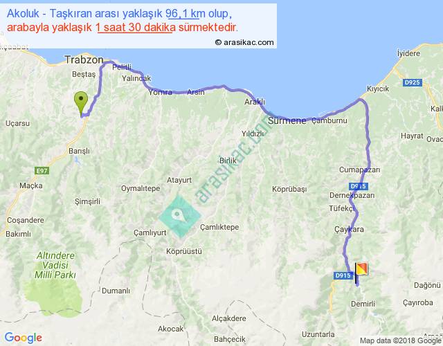 Akoluk - Taşkıran arası yaklaşık olarak 90 km/h ile yukarıda belirtilen sürede olup, iki yerin kuş uçuşu uzaklığı (mesafesi) 53'dir. Yolculuk otobüsle 1 saat 57 dakika sürmektedir.