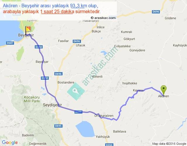 Akören - Beyşehir arası yaklaşık olarak 90 km/h ile yukarıda belirtilen sürede olup, iki yerin kuş uçuşu uzaklığı (mesafesi) 62'dir. Yolculuk otobüsle 1 saat 50 dakika sürmektedir.