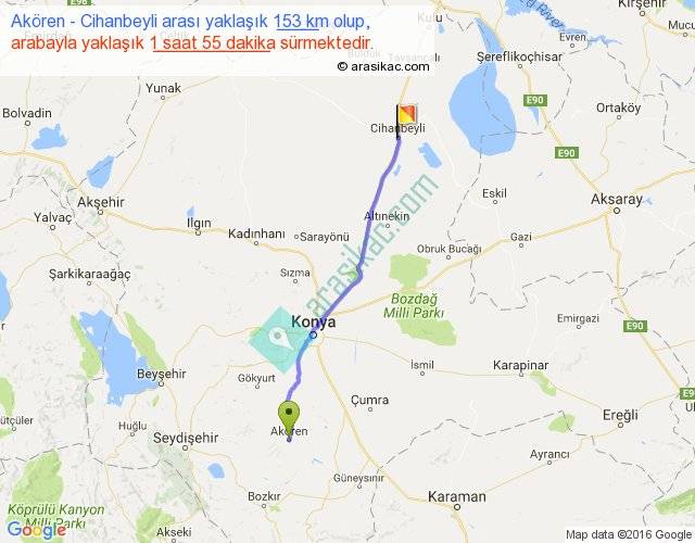 Akören - Cihanbeyli arası yaklaşık olarak 90 km/h ile yukarıda belirtilen sürede olup, iki yerin kuş uçuşu uzaklığı (mesafesi) 142'dir. Yolculuk otobüsle 2 saat 29 dakika sürmektedir.