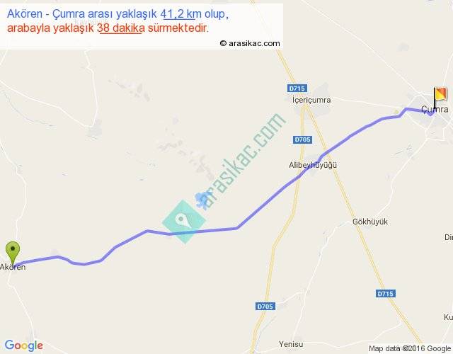 Akören - Çumra arası yaklaşık olarak 90 km/h ile yukarıda belirtilen sürede olup, iki yerin kuş uçuşu uzaklığı (mesafesi) 38'dir. Yolculuk otobüsle 49 dakika sürmektedir.