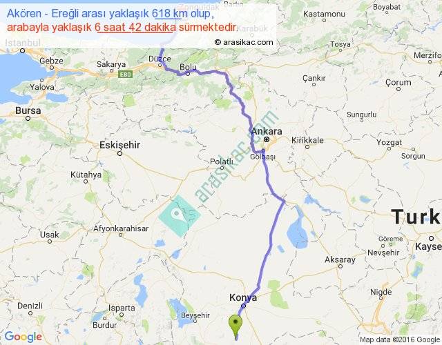 Akören - Ereğli arası yaklaşık olarak 90 km/h ile yukarıda belirtilen sürede olup, iki yerin kuş uçuşu uzaklığı (mesafesi) 431'dir. Eğer belirtilen yerler arasında uçak seferi var ise bu süre uçakla 39 dakika'ya kadar düşebilir. Yolculuk otobüsle 8 saat 42 dakika sürmektedir.