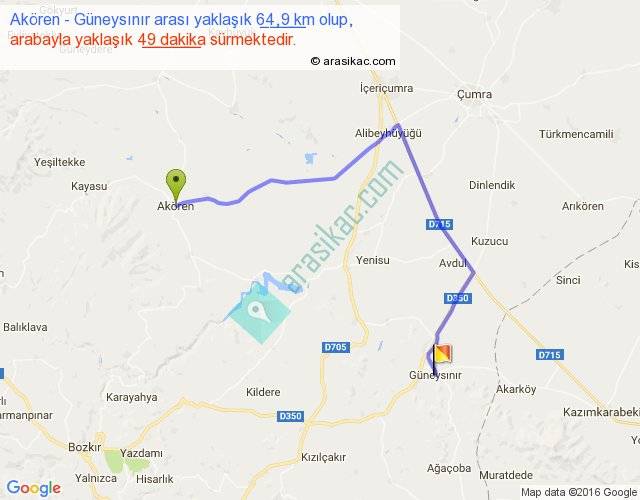 Akören - Güneysınır arası yaklaşık olarak 90 km/h ile yukarıda belirtilen sürede olup, iki yerin kuş uçuşu uzaklığı (mesafesi) 37'dir. Yolculuk otobüsle 1 saat 3 dakika sürmektedir.