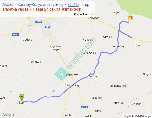 Akören - Karatay Konya arası yaklaşık olarak 90 km/h ile yukarıda belirtilen sürede olup, iki yerin kuş uçuşu uzaklığı (mesafesi) 67'dir. Yolculuk otobüsle 1 saat 51 dakika sürmektedir.