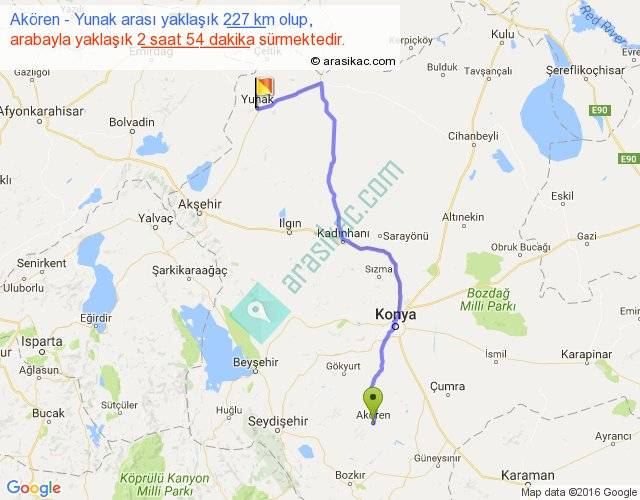 Akören - Yunak arası yaklaşık olarak 90 km/h ile yukarıda belirtilen sürede olup, iki yerin kuş uçuşu uzaklığı (mesafesi) 160'dir. Yolculuk otobüsle 3 saat 46 dakika sürmektedir.