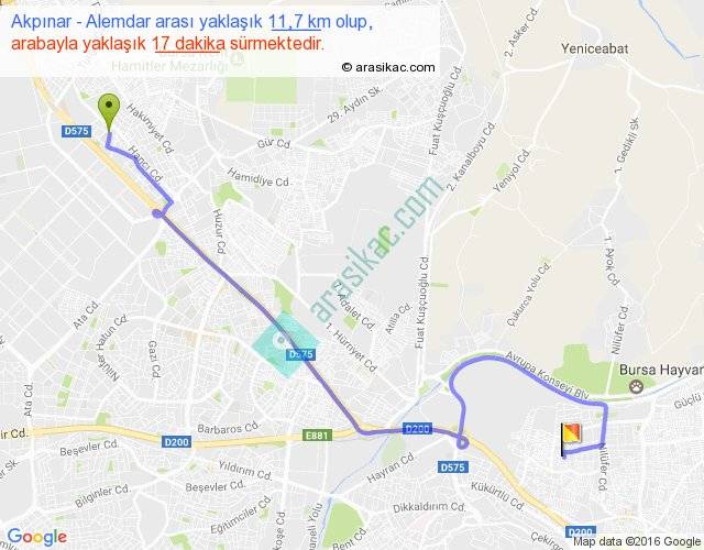 Akpınar - Alemdar arası yaklaşık olarak 90 km/h ile yukarıda belirtilen sürede olup, iki yerin kuş uçuşu uzaklığı (mesafesi) 7'dir. Yolculuk otobüsle 22 dakika sürmektedir.
