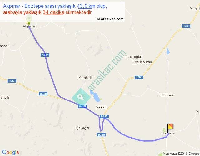 Akpınar - Boztepe arası yaklaşık olarak 90 km/h ile yukarıda belirtilen sürede olup, iki yerin kuş uçuşu uzaklığı (mesafesi) 33'dir. Yolculuk otobüsle 45 dakika sürmektedir.