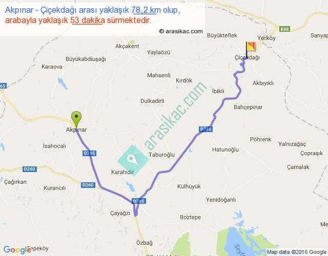 Akpınar - Çiçekdağı arası yaklaşık olarak 90 km/h ile yukarıda belirtilen sürede olup, iki yerin kuş uçuşu uzaklığı (mesafesi) 42'dir. Yolculuk otobüsle 1 saat 8 dakika sürmektedir.
