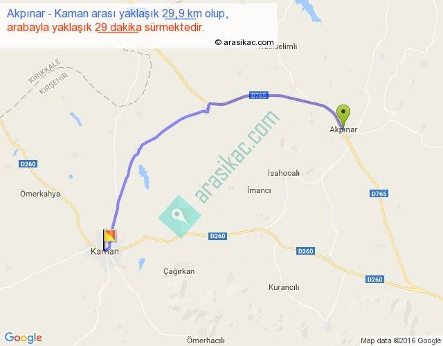 Akpınar - Kaman arası yaklaşık olarak 90 km/h ile yukarıda belirtilen sürede olup, iki yerin kuş uçuşu uzaklığı (mesafesi) 23'dir. Yolculuk otobüsle 37 dakika sürmektedir.