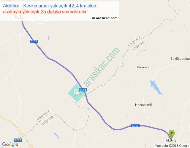 Akpınar - Keskin arası yaklaşık olarak 90 km/h ile yukarıda belirtilen sürede olup, iki yerin kuş uçuşu uzaklığı (mesafesi) 38'dir. Yolculuk otobüsle 32 dakika sürmektedir.