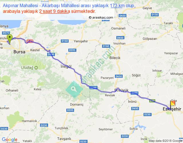 Akpınar Mahallesi - Akarbaşı Mahallesi arası yaklaşık olarak 90 km/h ile yukarıda belirtilen sürede olup, iki yerin kuş uçuşu uzaklığı (mesafesi) 141'dir. Yolculuk otobüsle 2 saat 47 dakika sürmektedir.