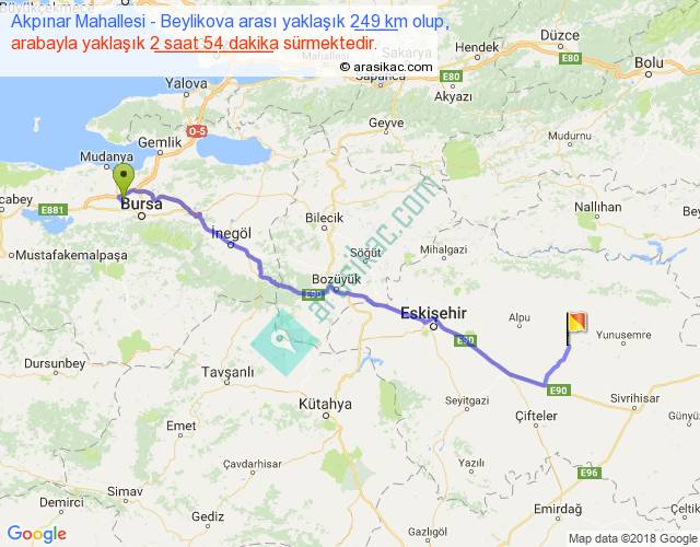 Akpınar Mahallesi - Beylikova arası yaklaşık olarak 90 km/h ile yukarıda belirtilen sürede olup, iki yerin kuş uçuşu uzaklığı (mesafesi) 199'dir. Yolculuk otobüsle 3 saat 46 dakika sürmektedir.