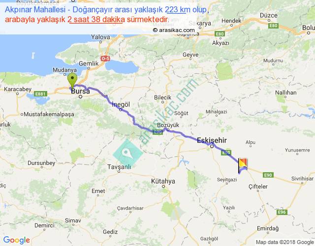 Akpınar Mahallesi - Doğançayır arası yaklaşık olarak 90 km/h ile yukarıda belirtilen sürede olup, iki yerin kuş uçuşu uzaklığı (mesafesi) 176'dir. Yolculuk otobüsle 3 saat 25 dakika sürmektedir.