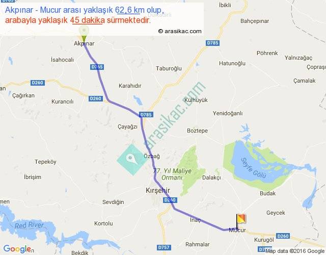 Akpınar - Mucur arası yaklaşık olarak 90 km/h ile yukarıda belirtilen sürede olup, iki yerin kuş uçuşu uzaklığı (mesafesi) 56'dir. Yolculuk otobüsle 58 dakika sürmektedir.
