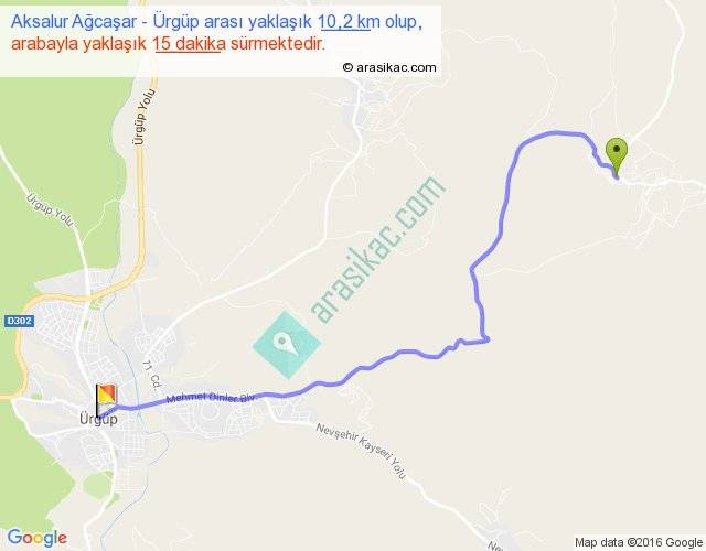 Aksalur Ağcaşar - Ürgüp arası yaklaşık olarak 90 km/h ile yukarıda belirtilen sürede olup, iki yerin kuş uçuşu uzaklığı (mesafesi) 8'dir. Yolculuk otobüsle 19 dakika sürmektedir.