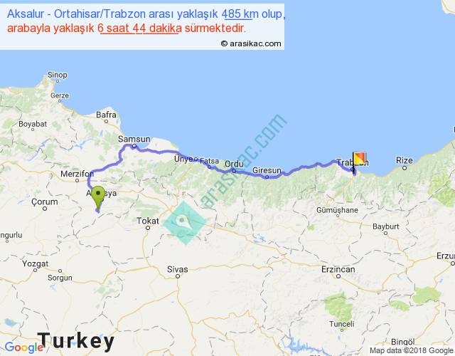 Aksalur - Ortahisar Trabzon arası yaklaşık olarak 90 km/h ile yukarıda belirtilen sürede olup, iki yerin kuş uçuşu uzaklığı (mesafesi) 334'dir. Eğer belirtilen yerler arasında uçak seferi var ise bu süre uçakla 30 dakika'ya kadar düşebilir. Yolculuk otobüsle 8 saat 45 dakika sürmektedir.
