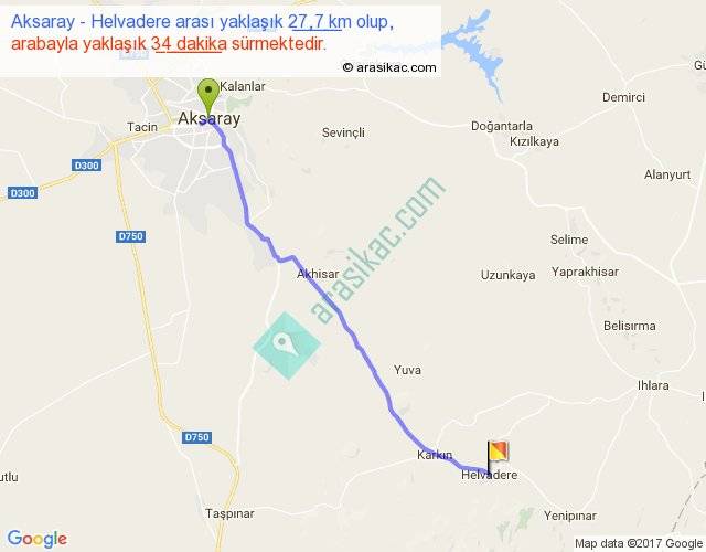 Aksaray - Helvadere arası yaklaşık olarak 90 km/h ile yukarıda belirtilen sürede olup, iki yerin kuş uçuşu uzaklığı (mesafesi) 24'dir. Yolculuk otobüsle 44 dakika sürmektedir.