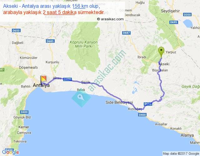 Akseki - Antalya arası yaklaşık olarak 90 km/h ile yukarıda belirtilen sürede olup, iki yerin kuş uçuşu uzaklığı (mesafesi) 95'dir. Yolculuk otobüsle 2 saat 42 dakika sürmektedir.