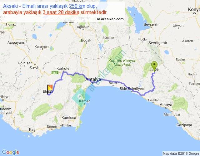 Akseki - Elmalı arası yaklaşık olarak 90 km/h ile yukarıda belirtilen sürede olup, iki yerin kuş uçuşu uzaklığı (mesafesi) 169'dir. Yolculuk otobüsle 4 saat 30 dakika sürmektedir.