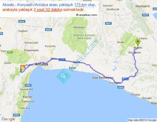 Akseki - Konyaaltı Antalya arası yaklaşık olarak 90 km/h ile yukarıda belirtilen sürede olup, iki yerin kuş uçuşu uzaklığı (mesafesi) 118'dir. Yolculuk otobüsle 3 saat 17 dakika sürmektedir.