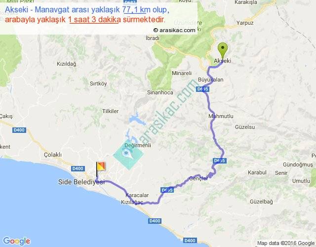 Akseki - Manavgat arası yaklaşık olarak 90 km/h ile yukarıda belirtilen sürede olup, iki yerin kuş uçuşu uzaklığı (mesafesi) 42'dir. Yolculuk otobüsle 1 saat 21 dakika sürmektedir.