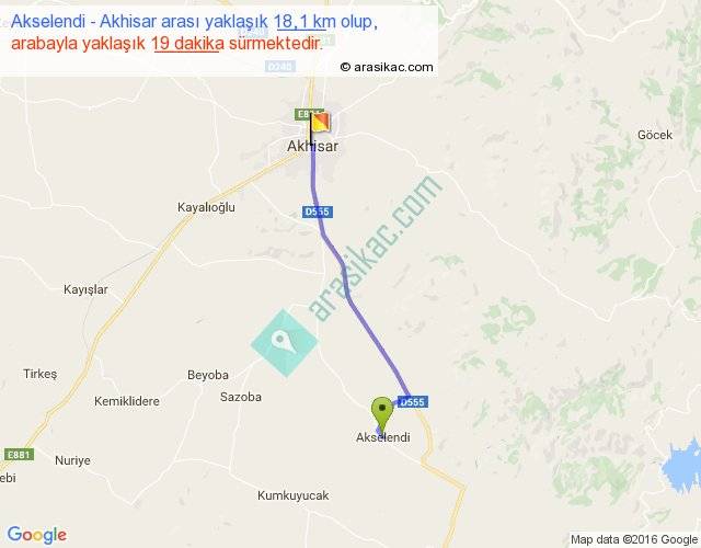 Akselendi - Akhisar arası yaklaşık olarak 90 km/h ile yukarıda belirtilen sürede olup, iki yerin kuş uçuşu uzaklığı (mesafesi) 16'dir. Yolculuk otobüsle 24 dakika sürmektedir.