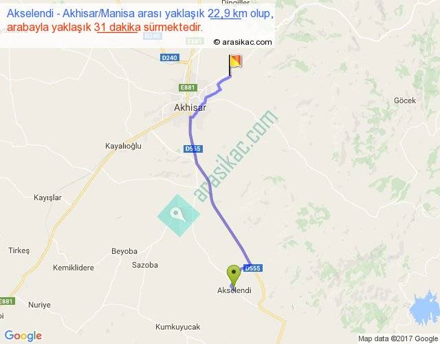 Akselendi - Akhisar Manisa arası yaklaşık olarak 90 km/h ile yukarıda belirtilen sürede olup, iki yerin kuş uçuşu uzaklığı (mesafesi) 18'dir. Yolculuk otobüsle 40 dakika sürmektedir.
