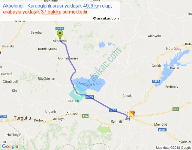 Akselendi - Karaoğlanlı arası yaklaşık olarak 90 km/h ile yukarıda belirtilen sürede olup, iki yerin kuş uçuşu uzaklığı (mesafesi) 42'dir. Yolculuk otobüsle 48 dakika sürmektedir.