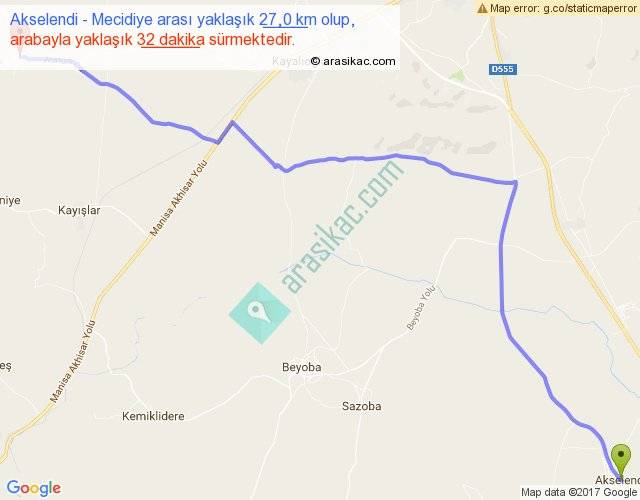 Akselendi - Mecidiye arası yaklaşık olarak 90 km/h ile yukarıda belirtilen sürede olup, iki yerin kuş uçuşu uzaklığı (mesafesi) 22'dir. Yolculuk otobüsle 41 dakika sürmektedir.