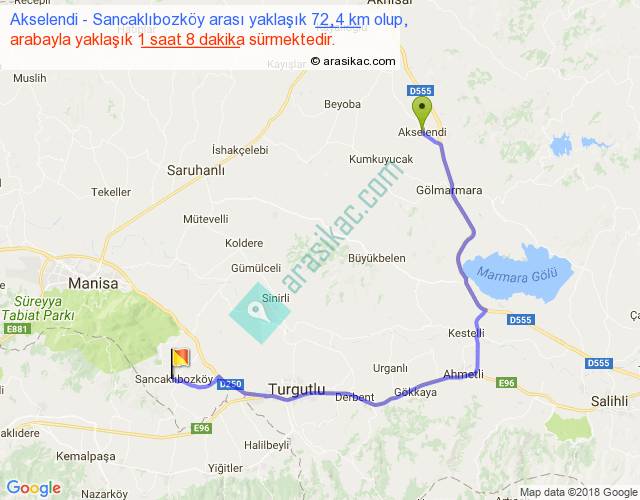 Akselendi - Sancaklıbozköy arası yaklaşık olarak 90 km/h ile yukarıda belirtilen sürede olup, iki yerin kuş uçuşu uzaklığı (mesafesi) 42'dir. Yolculuk otobüsle 1 saat 28 dakika sürmektedir.