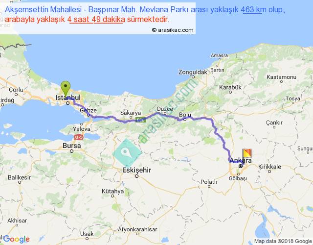 Akşemsettin Mahallesi - Başpınar Mah. Mevlana Parkı arası yaklaşık olarak 90 km/h ile yukarıda belirtilen sürede olup, iki yerin kuş uçuşu uzaklığı (mesafesi) 358'dir. Eğer belirtilen yerler arasında uçak seferi var ise bu süre uçakla 33 dakika'ya kadar düşebilir. Yolculuk otobüsle 6 saat 15 dakika sürmektedir.
