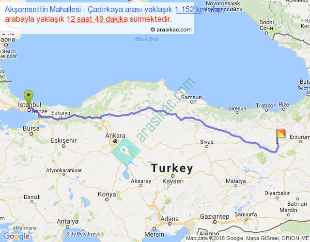 Akşemsettin Mahallesi - Çadırkaya arası yaklaşık olarak 90 km/h ile yukarıda belirtilen sürede olup, iki yerin kuş uçuşu uzaklığı (mesafesi) 959'dir. Eğer belirtilen yerler arasında uçak seferi var ise bu süre uçakla 1 saat 28 dakika'ya kadar düşebilir. Yolculuk otobüsle 16 saat 39 dakika sürmektedir.