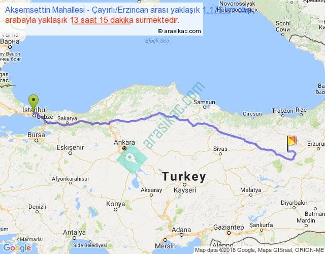 Akşemsettin Mahallesi - Çayırlı Erzincan arası yaklaşık olarak 90 km/h ile yukarıda belirtilen sürede olup, iki yerin kuş uçuşu uzaklığı (mesafesi) 937'dir. Eğer belirtilen yerler arasında uçak seferi var ise bu süre uçakla 1 saat 26 dakika'ya kadar düşebilir. Yolculuk otobüsle 17 saat 13 dakika sürmektedir.